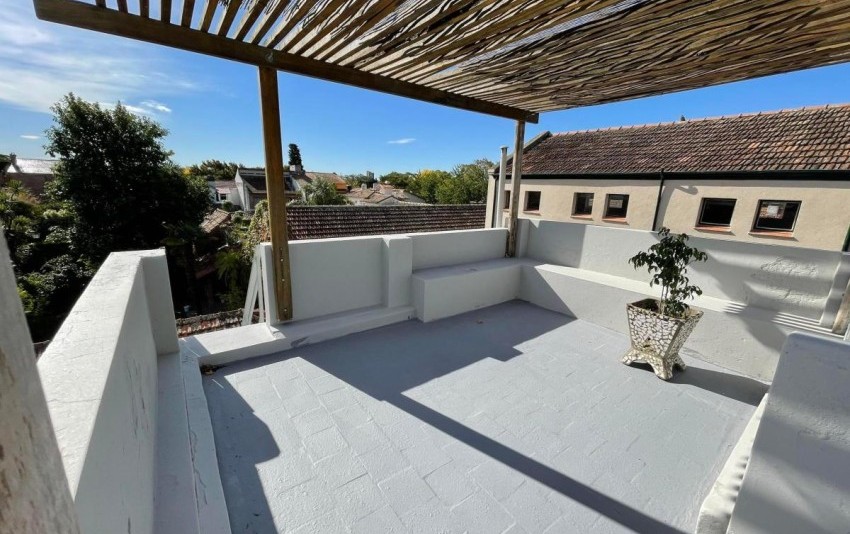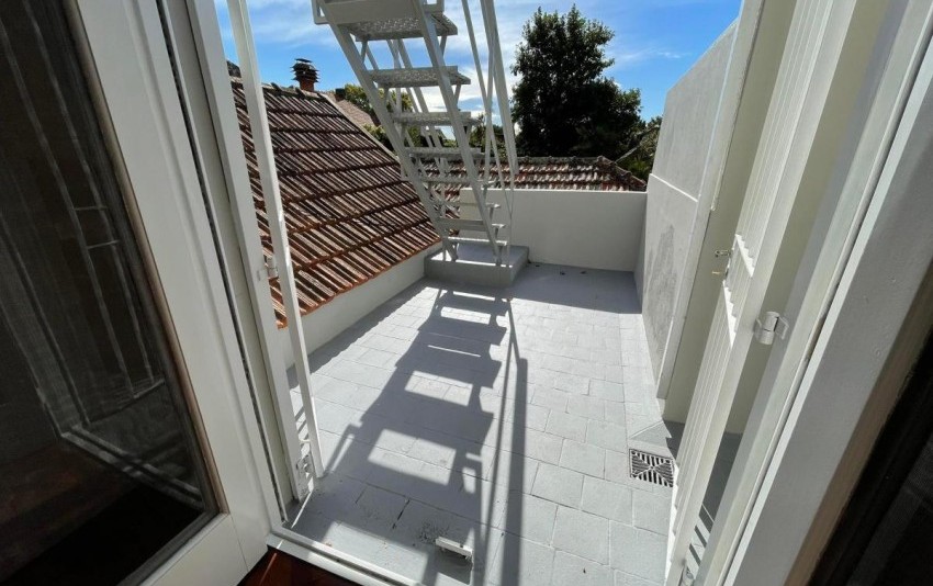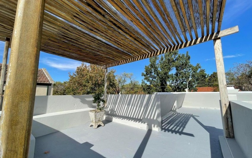 Escalera a una gran terraza con pérgola. Divina! Vista abierta a copa de árboles.